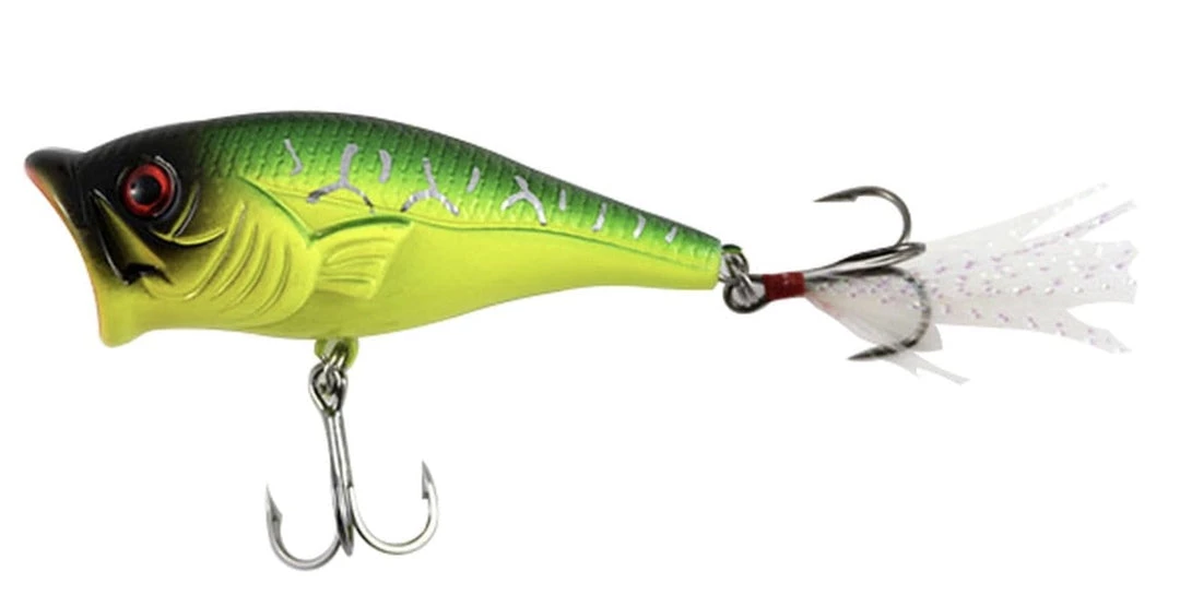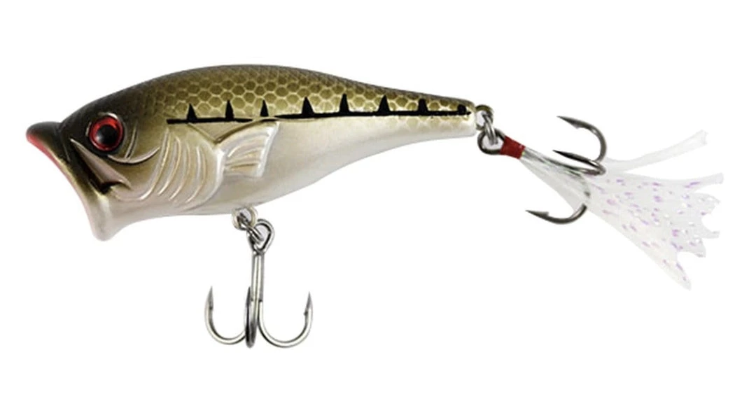 The SteelShad Popper is a 2-3/4 inch long popper with white rear feather comes equipped with nickel coated razor sharp hooks and weighs 3/8 oz. Calm, slow retrieves and frequent pauses highlighted with sharp rod tip jerks produce an enticing, loud, easy bass snack target!